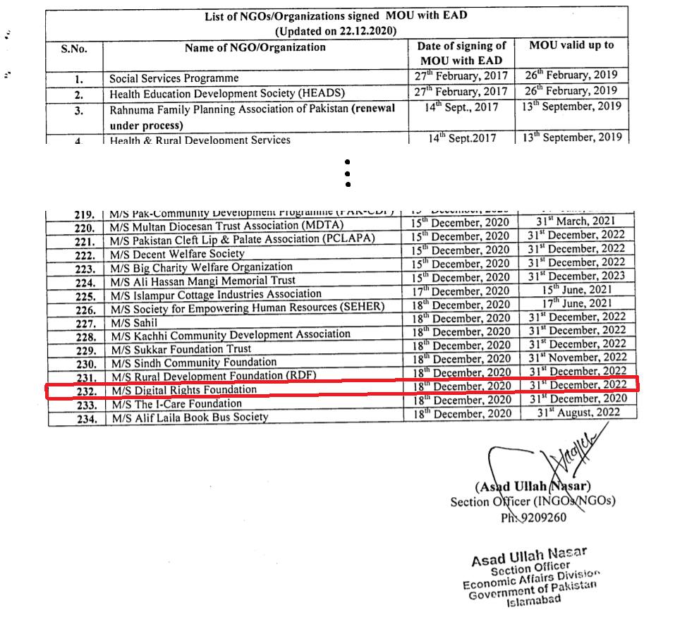 Requirement for submitting audit is included in the terms for Memorandum of Understanding with the Economic Affairs Division. Digital Rights Foundation is listed as signatory no. 232 on EAD’s website, and their MoU is valid up to 31 December 2022.