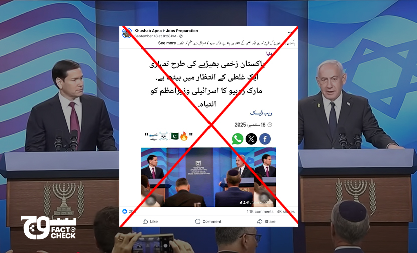 An image showing Rubio and Netanyahu during a recent joint press conference was shared online on 18 September. It contained the following text: پاکستان زخمی بھیڑیے کی طرح تمہاری ایک غلطی کے انتظار میں بیٹھا ہے مارک روبیو کا اسرائیلی وزیراعظم کو انتباہ