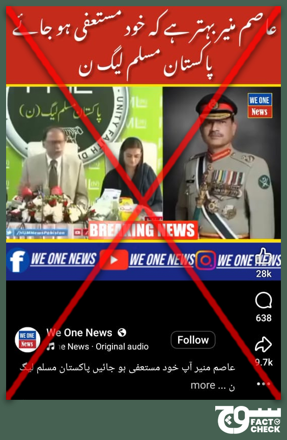 On 20 October 2025, Facebook page ‘We One News’ posted (archive) a video showing a press conference by Planning and Development Minister Ahsan Iqbal and Punjab Senior Minister Marriyum Aurangzeb on one side and an image of the military chief, Field Marshal Munir, on the other.