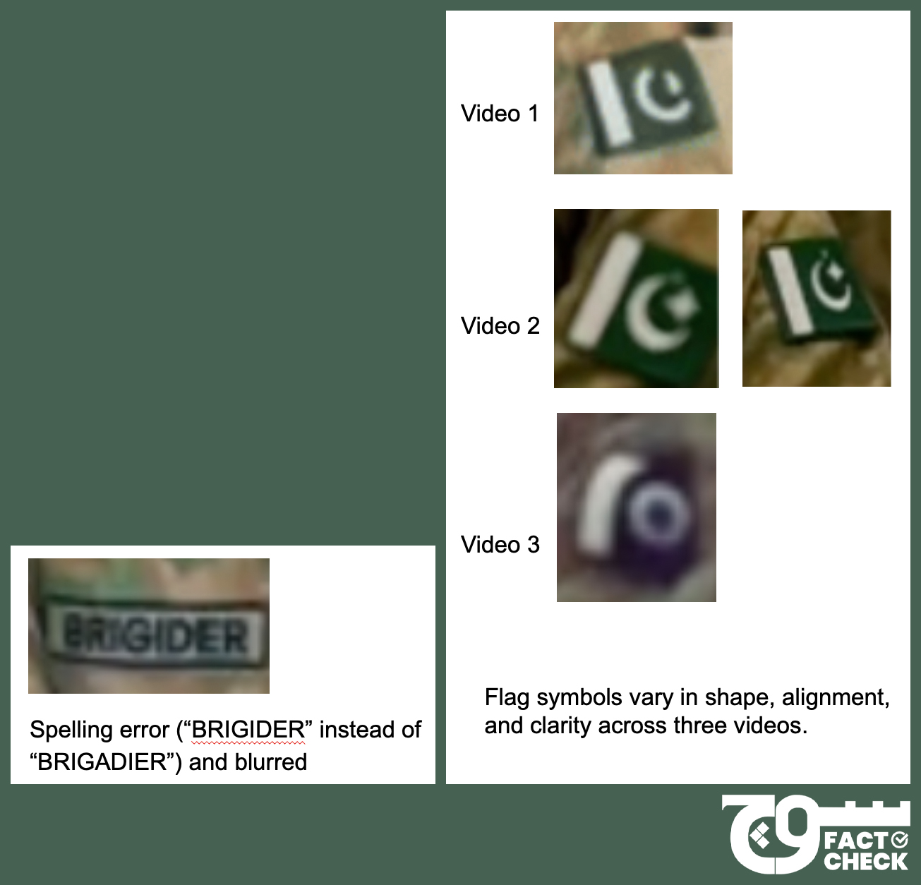 In the third video, the tags originally seen on the Pakistan Army’s uniforms — containing the soldiers’ names and their affiliation, “PAK ARMY” — do not appear on the shirt of the man in the centre; in fact, the text is illegible. His phone or hands do not move naturally either. The Pakistani flag’s patch on the shoulders of the two men on the right has a circle instead of a crescent and a five-pointed star.