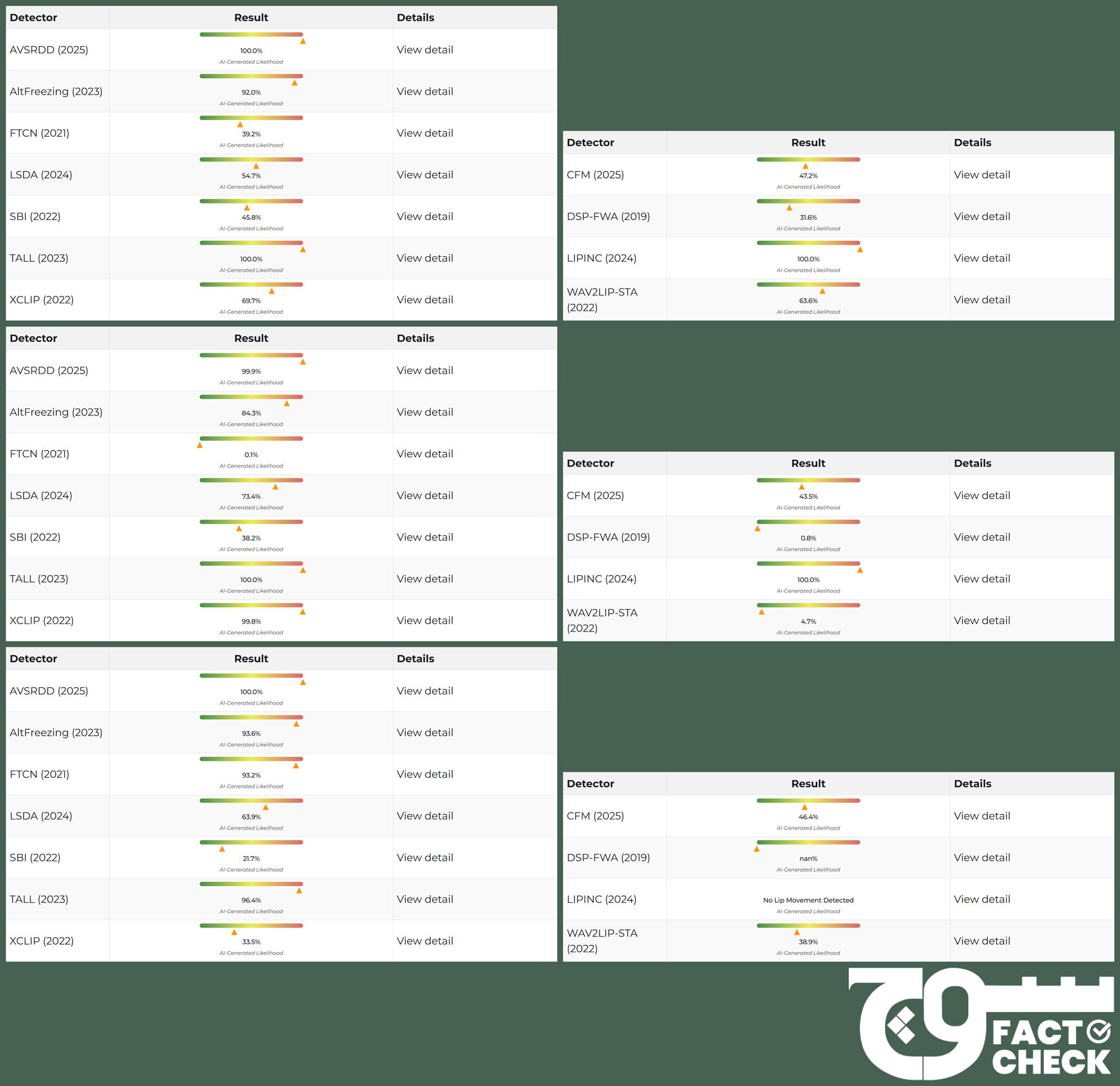 The Hiya Deepfake Voice Detector revealed that there is a 97% chance all three videos were AI-generated, whereas the Zhuque AI Detection Assistant said the probabilities that the first, second, and third clips were synthetically created are 67.8%, 84.6%, and 31.4%, respectively.