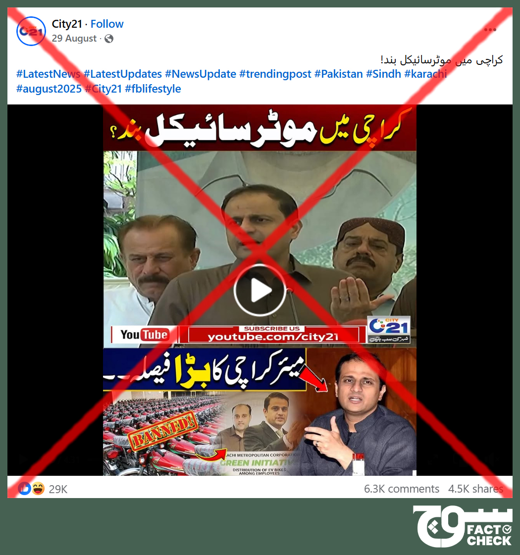 Conclusion: The claim is false and the City21 deployed clickbait. Motorbikes have not been banned in Karachi. Mayor Murtaza Wahab announced a transition from conventional to electric bikes only in the KMC.