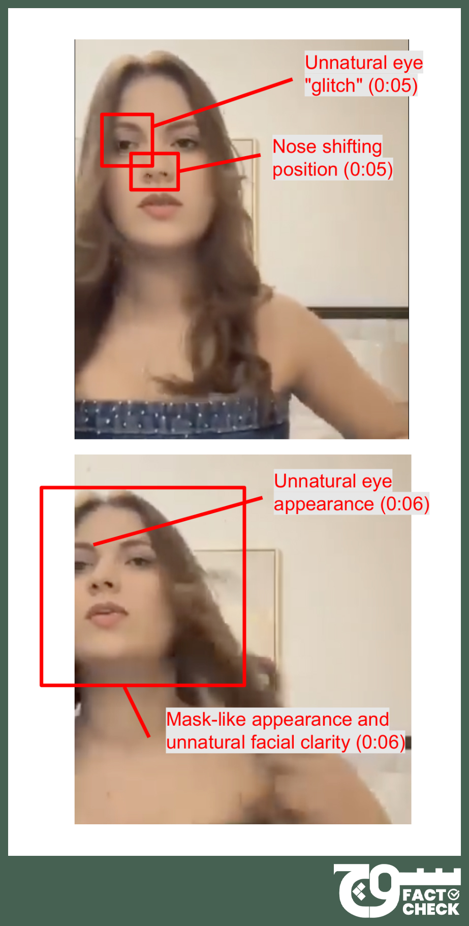 For example, “the subject’s face is unnaturally clear visually, despite the blurred surrounding appearance”, the GODDS analysts said. Her “eye appears to shift to be in two slightly different positions simultaneously” at the 0:04 and 0:05 markers, they added, noting that it “appears almost as a ‘glitch,’ instead of blurred features caused by movement”.