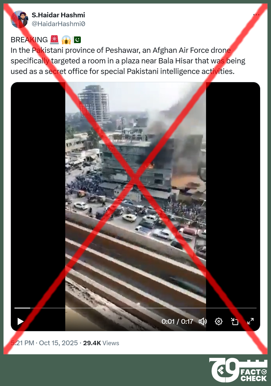 On 15 October 2025, X (formerly Twitter) user @HaidarHashmi0 posted (archive) a video claiming that Afghanistan’s forces successfully targeted and destroyed an office of Pakistani intelligence operatives, resulting in a fire.