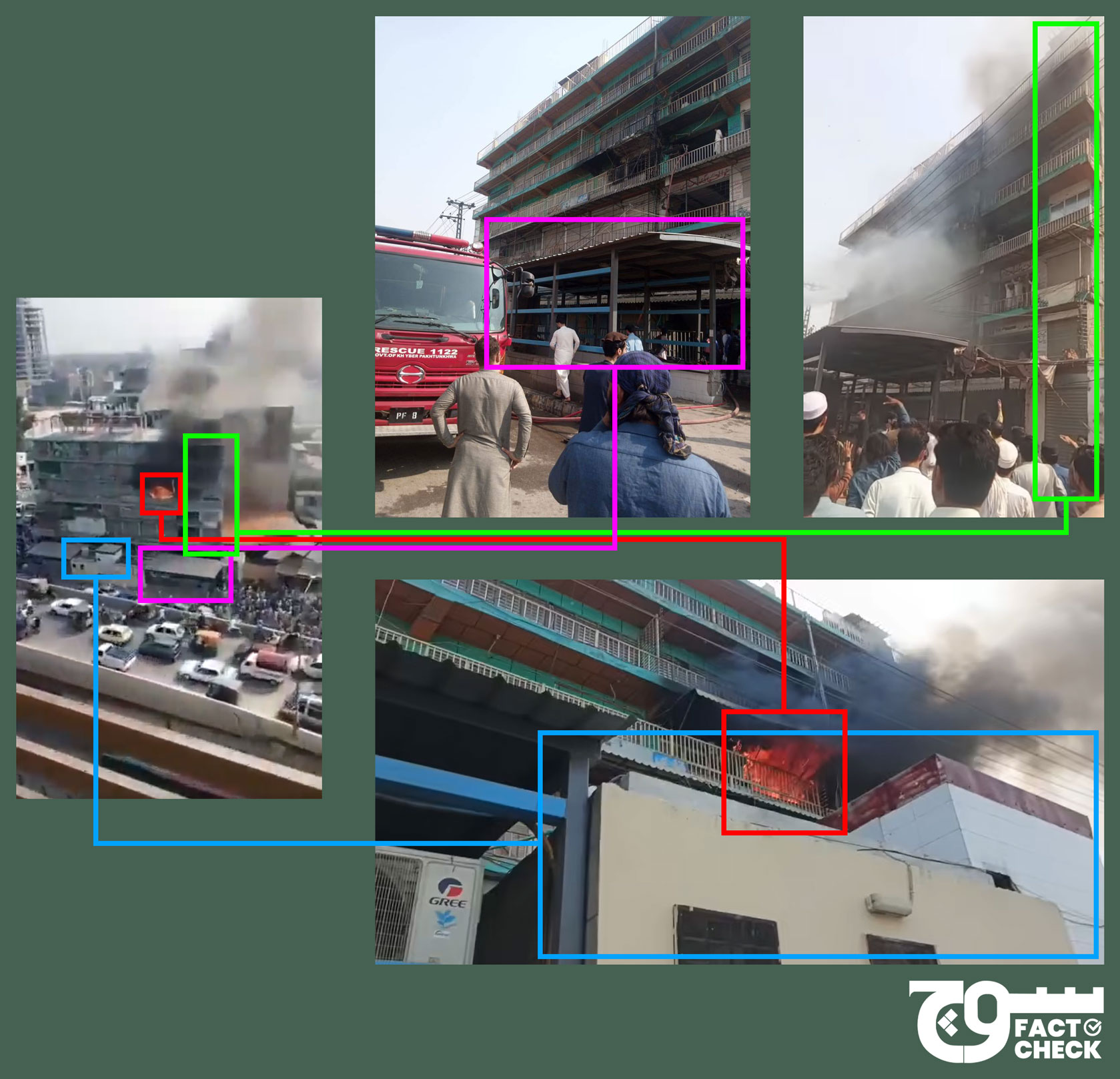 Using relevant keywords, we were able to trace at least three other videos of the same fire incident at Ittehad Plaza on Peshawar’s Ashraf Road but recorded from different angles.