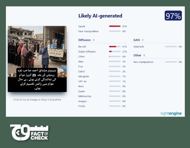 On 3 October, Deputy Prime Minister and Foreign Minister Ishaq Dar confirmed that the former senator had been detained by Israel. On 6 October, the Foreign Office announced that it is working to secure his safe evacuation. These developments confirmed that the Flotilla was seized by Israeli forces before it could reach Gaza. Therefore, the image claiming to show Mushtaq Ahmad distributing aid is fake.
