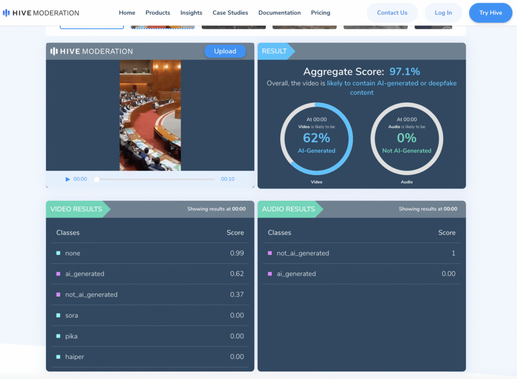 Finally, Soch Fact Check also ran the clip through Hive Moderation, an AI-detection tool. It gave an aggregate score of 97.1% which means that “overall, the video is likely to contain AI-generated or deepfake content”.
