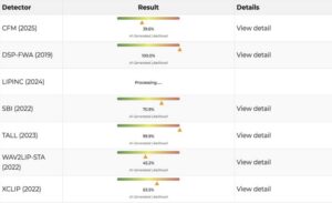 To further investigate if the video was altered, we ran it through DeepFake-o-Meter, an AI-based tool that detects manipulated or synthetic media, particularly deepfakes. It uses multiple detection models to analyse visual and audio cues that may indicate tampering. The results were as follows: