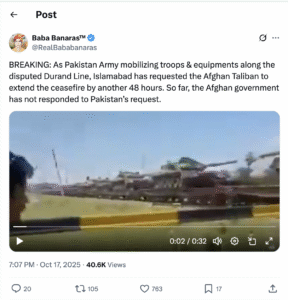 On 17 October, an X user, well-known for spreading disinformation, posted a video (archive) that apparently showed Pakistan moving its forces and equipment to the Pakistan-Afghanistan border during the recent deadly clashes between the two countries. The screenshot below shows the post making the claim: