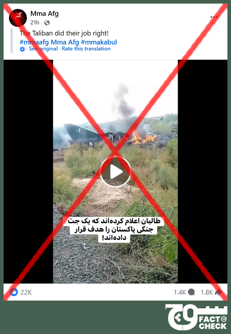 On 12 October 2025, Facebook page ‘Mma Afg’ posted (archive) a video showing a crashed fighter jet ablaze, alongside the following caption in Dari: