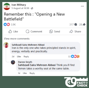Upon further investigation, it was revealed that the Facebook page cited in the post has, on multiple occasions, posed as an official page for the Iranian military, posting threatening messages such as: “Remember this: Opening a New Battlefield” as recently as 5 August 2025. Since the page is named Iran Military, Facebook users seem to have misconstrued its posts as official messages from the Iranian military.