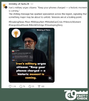 Claim: Iran’s military has urged citizens to keep their phones charged in preparation for a “historic moment”, signalling that “something major” is about to unfold.