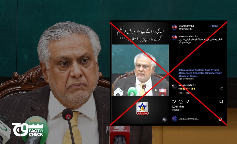 Soch Fact Check found the claim dubious as Dar did not mention Israel or make any statements regarding its recognition at any point even in the accompanying video.