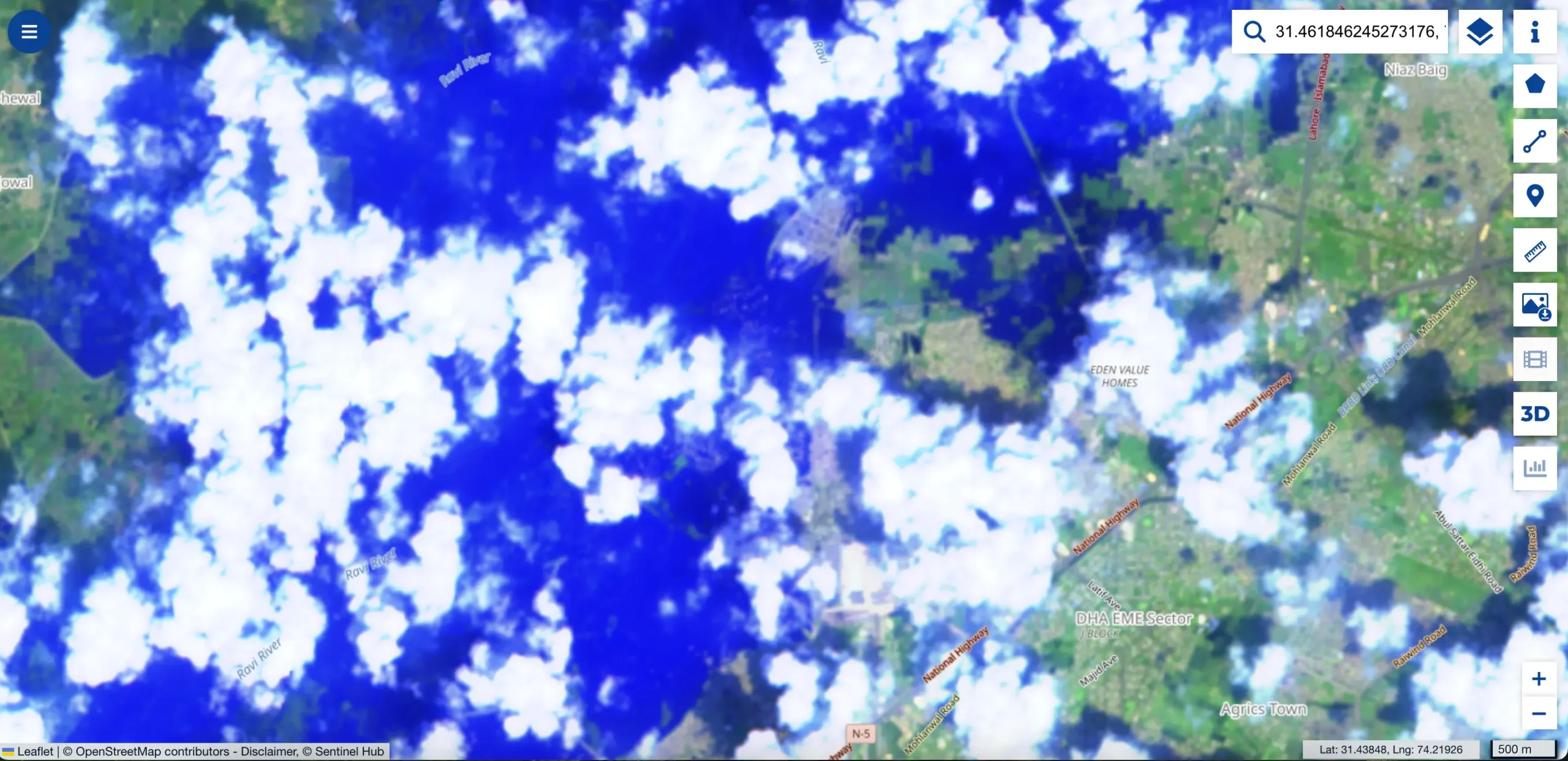 An aerial view of the residential area through Copernicus Browser, an online tool for viewing satellite images, shows that Park View City was flooded.