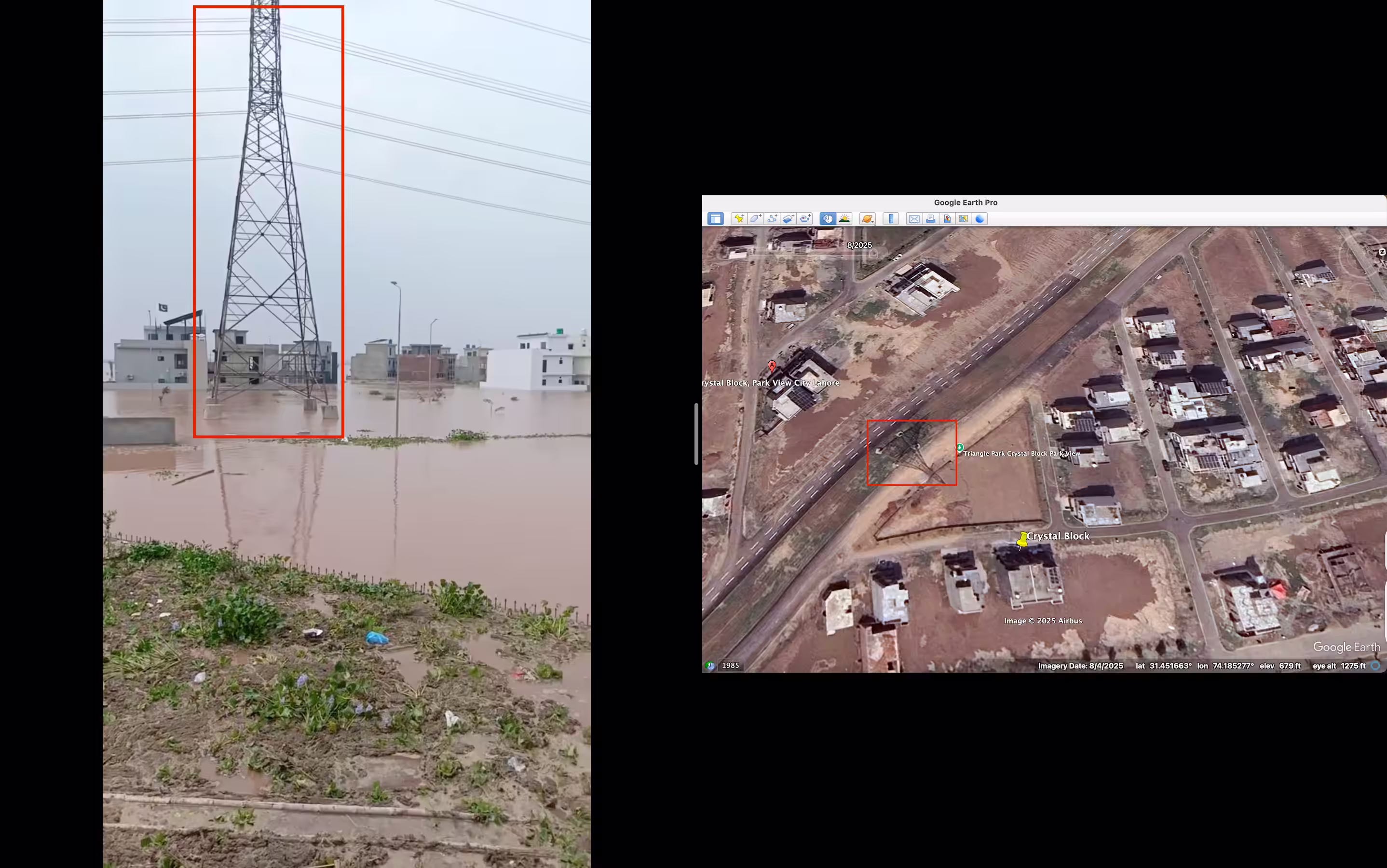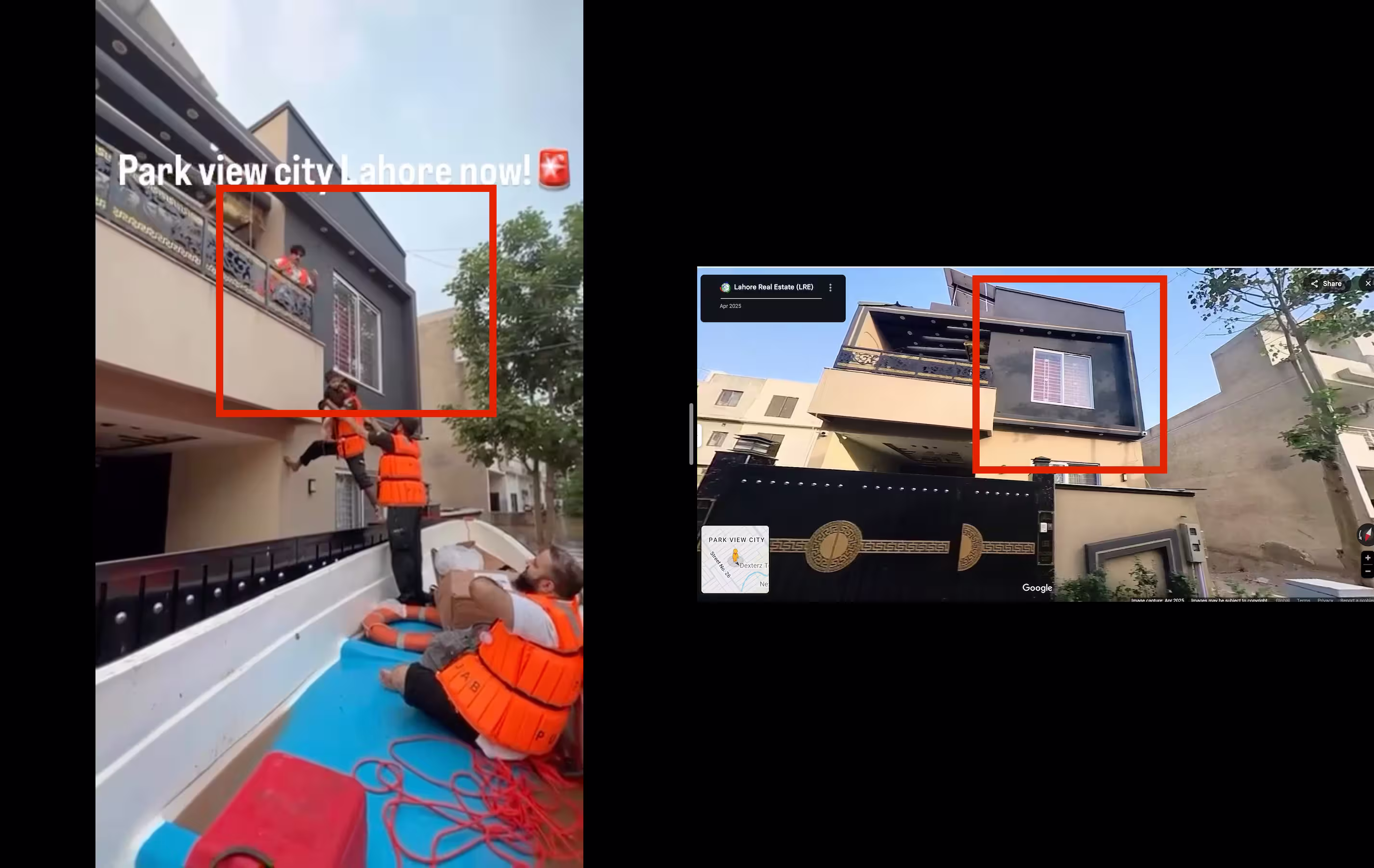 Following the same steps above (check “How we geolocated the video”), we verified another video from the Platinum Block showing rescue teams sailing through the submerged area, likely rescuing stranded residents. The coordinates for this clip are 31.45877952344545, 74.18263932152345.