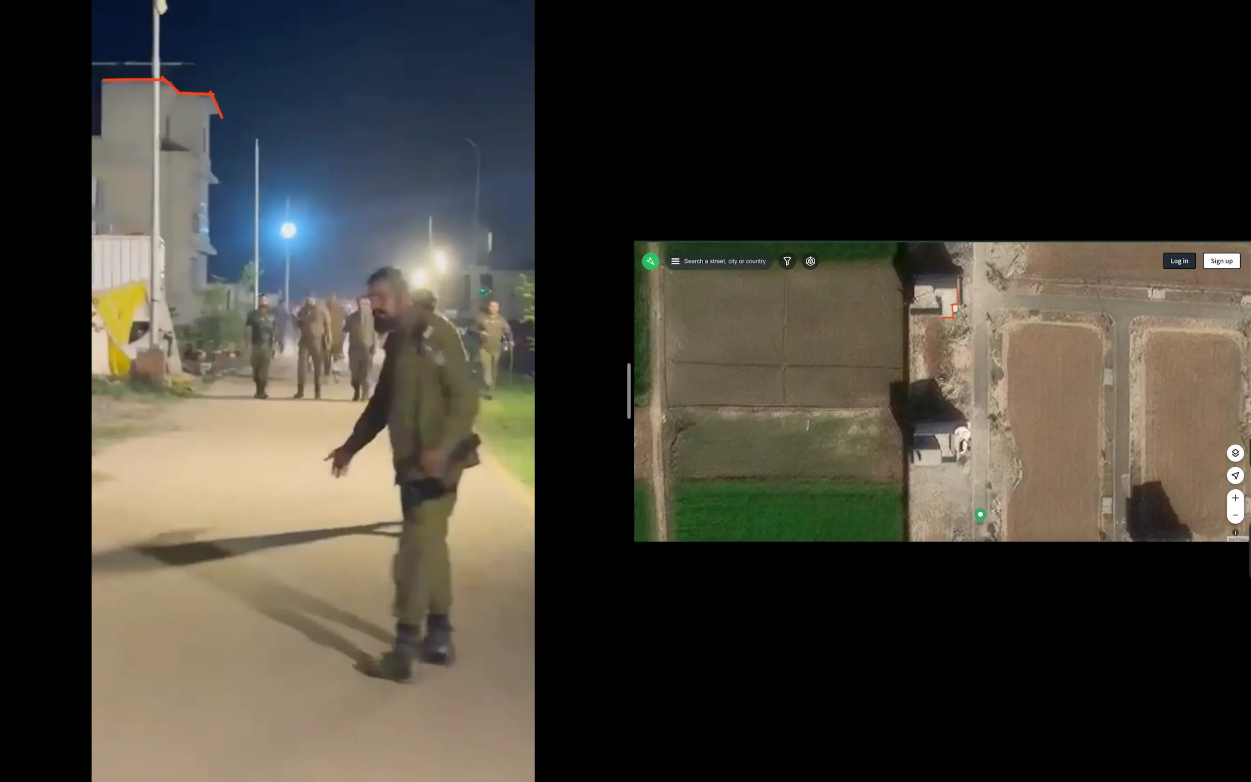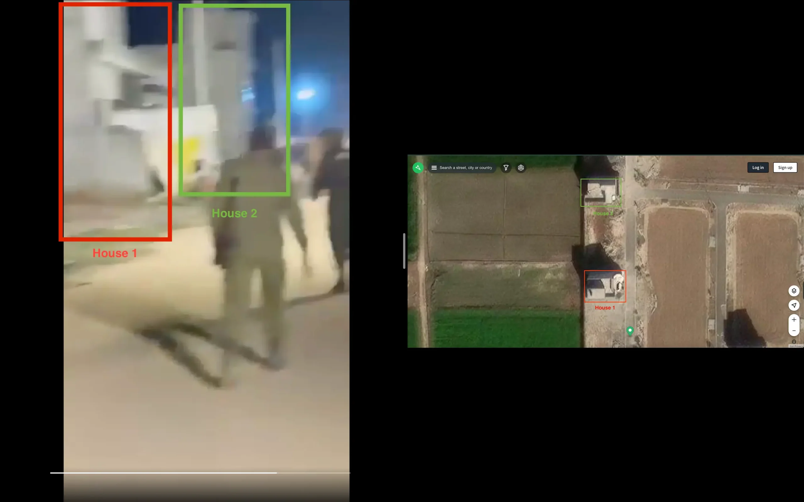 The two houses in the first clip also appear in the second one. On the left is the frame from the second video showing those structures that match the ones in the satellite imagery of the area, on the right.