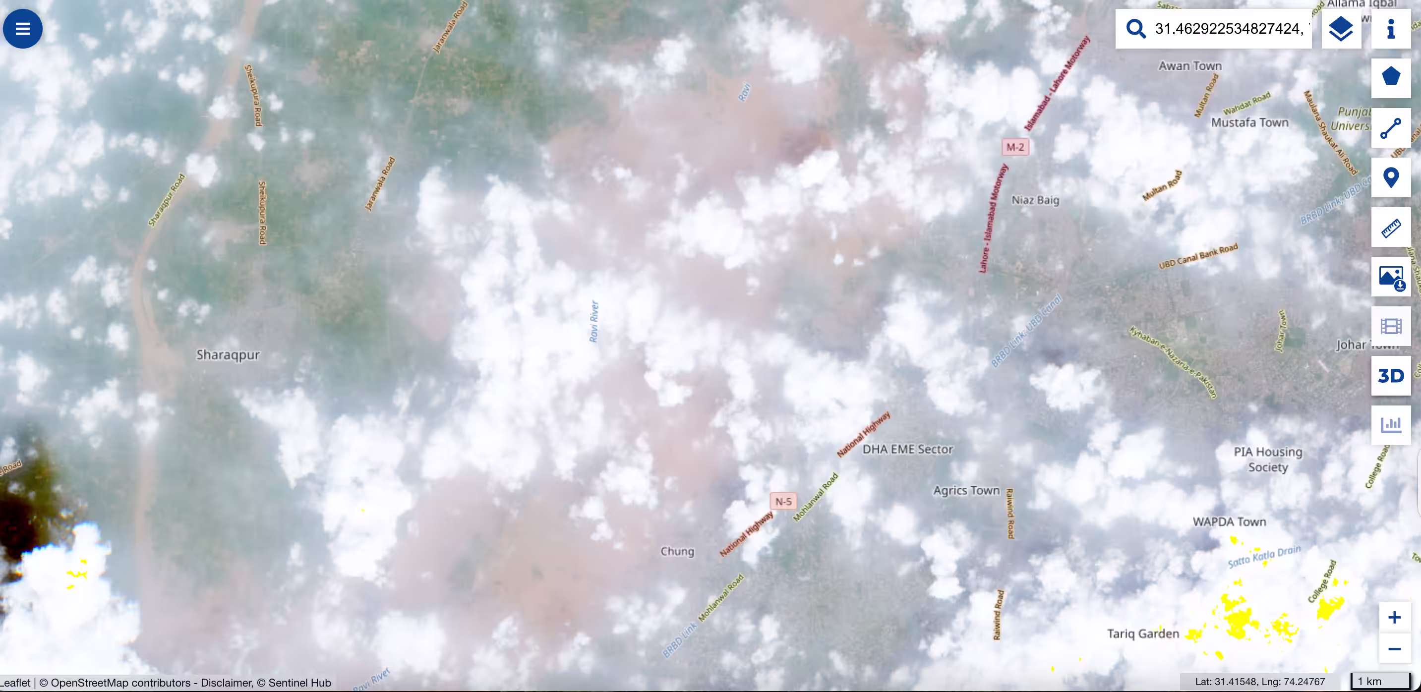 Geolocating this clip reveals that it was recorded at the coordinates 31.463662099631453, 74.17430712545962 on the edge of the riverbank in the Platinum Block.