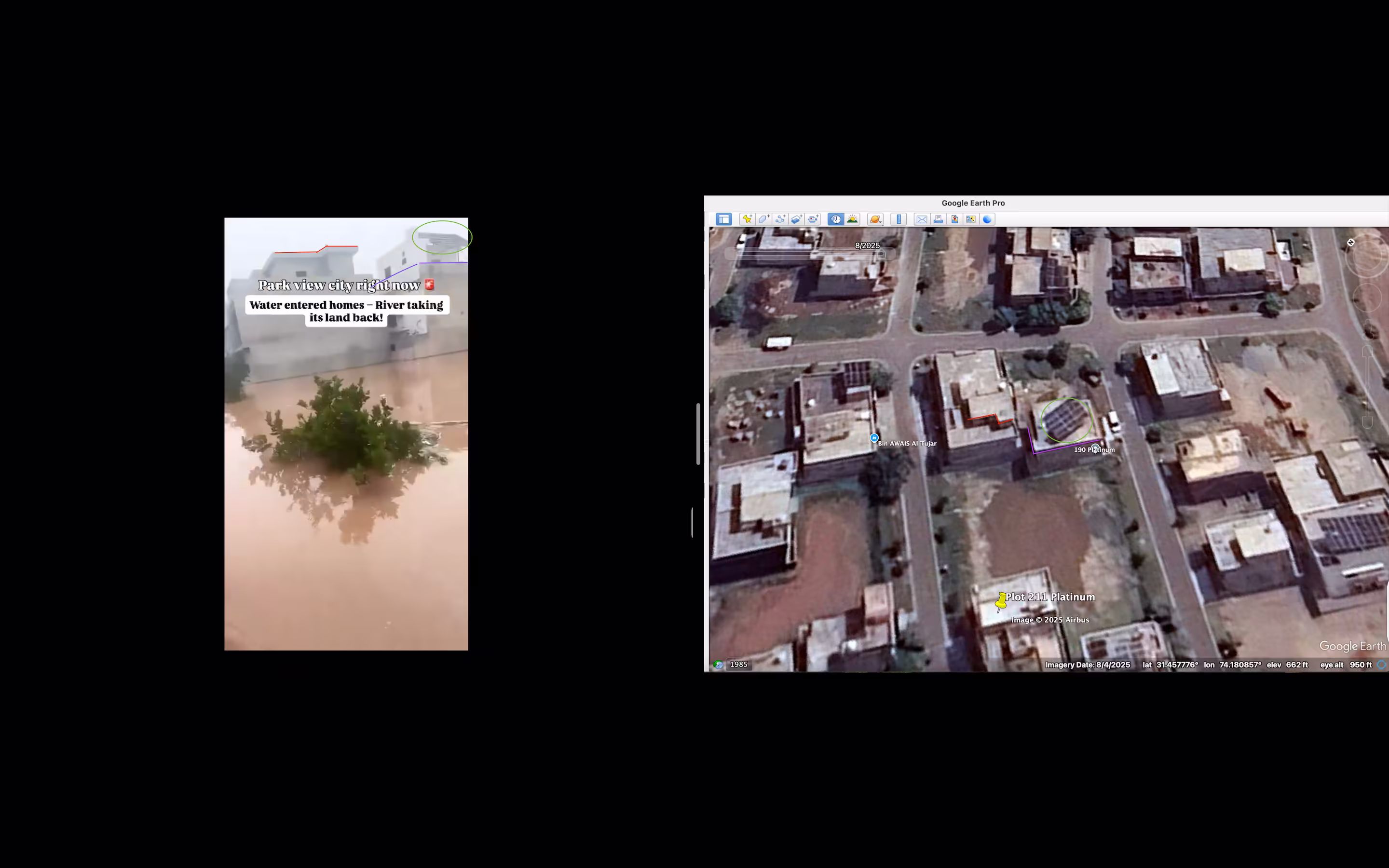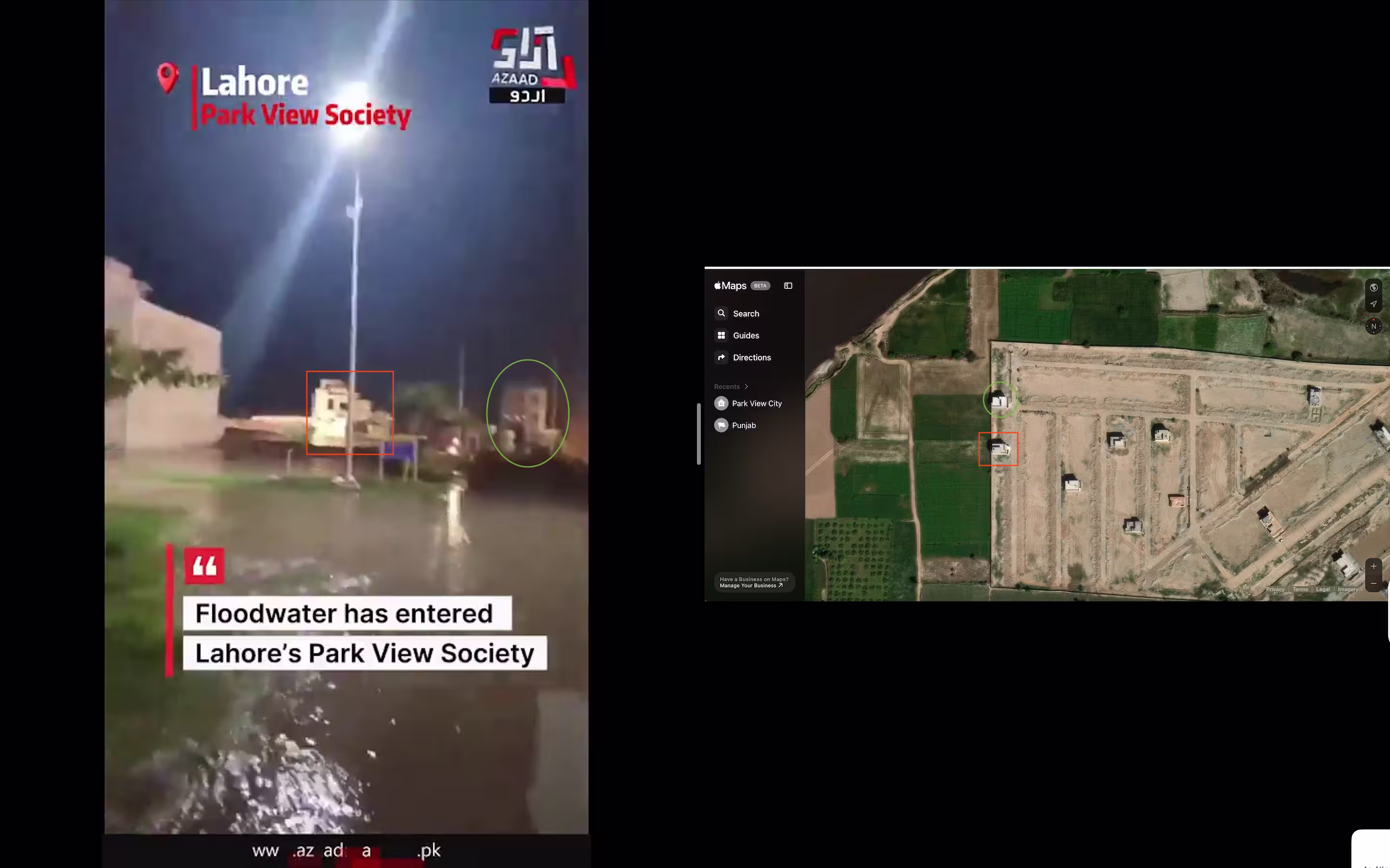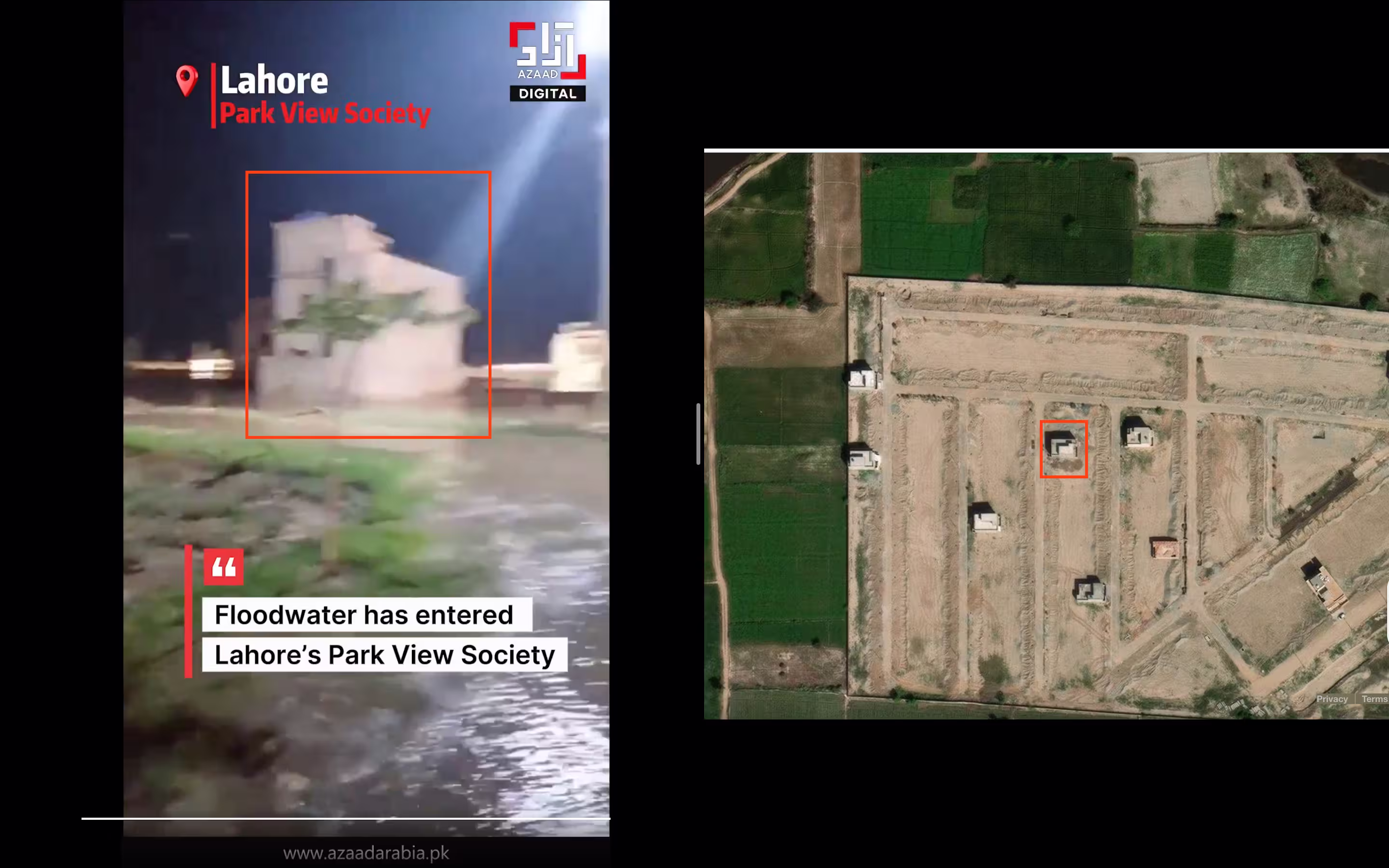 A second (archive) video of the Platinum Block, posted on 28 August on X (formerly Twitter), was geolocated to coordinates 31.464112309492883, 74.17555529502641. This clip shows floodwater having entered the Platinum Block after the embankments were breached (as shown in the first clip).