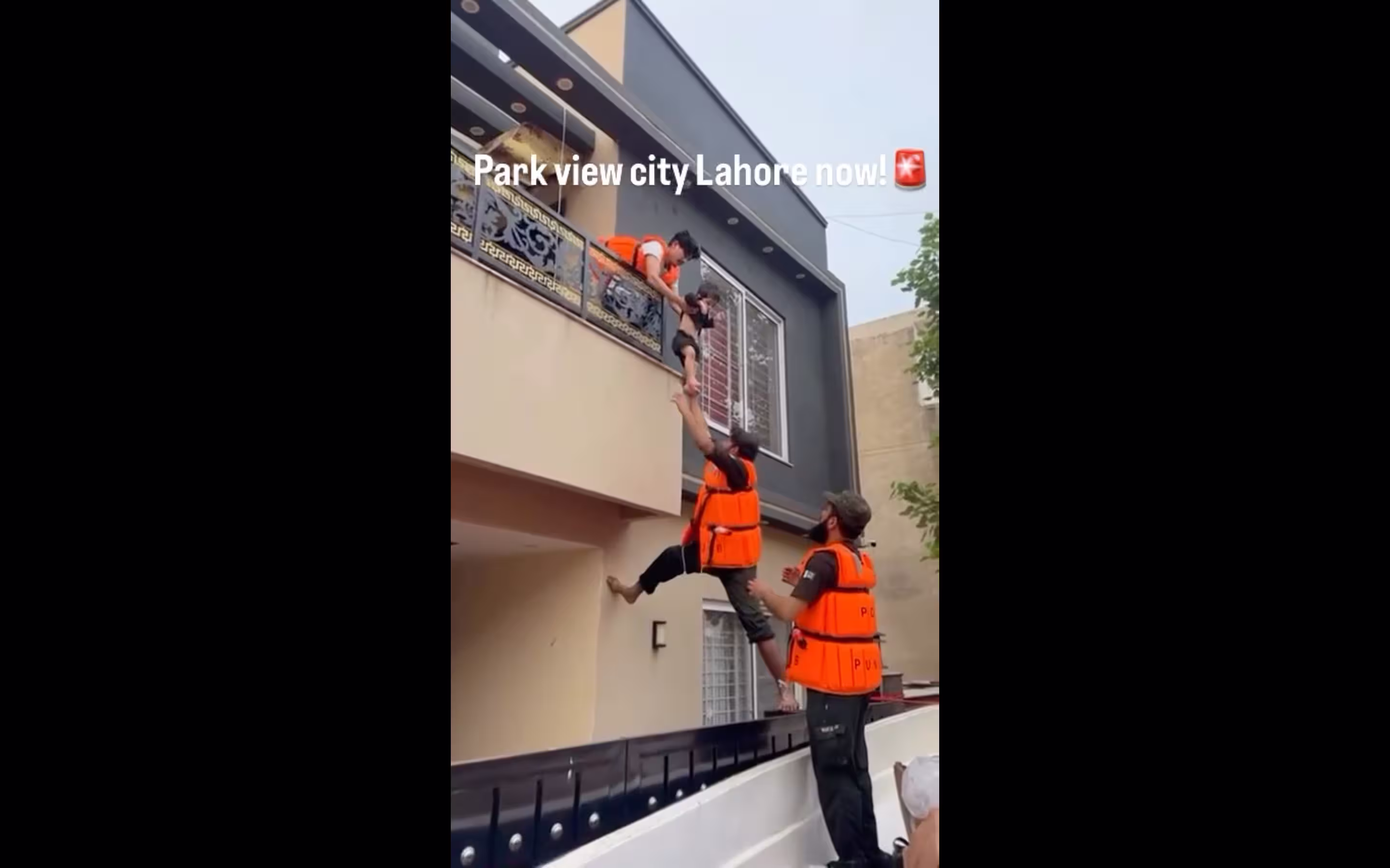 One such video from 13th Street in the Platinum Block shows a rescue team saving a stranded child from the second floor of a house submerged in floodwater. The exact location in this video was found at the coordinates 31.461728279111195, 74.18235694197806.