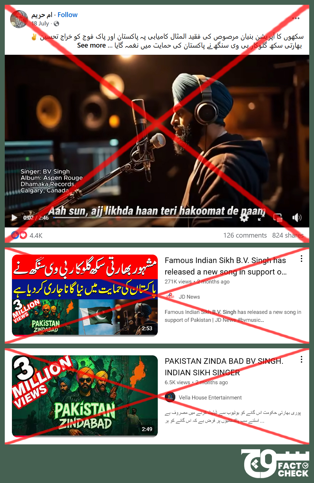 Claim: An Indian-Canadian Sikh singer named BV Singh released a song called “Pakistan Zindabad,” which criticises Indian government officials, praises the Pakistan Army and Operation Bunyan-um-Marsoos, and supports the Khalistan movement.