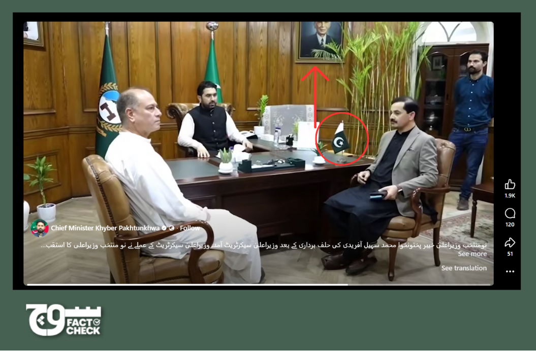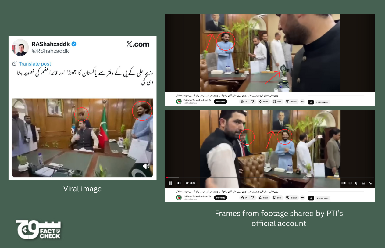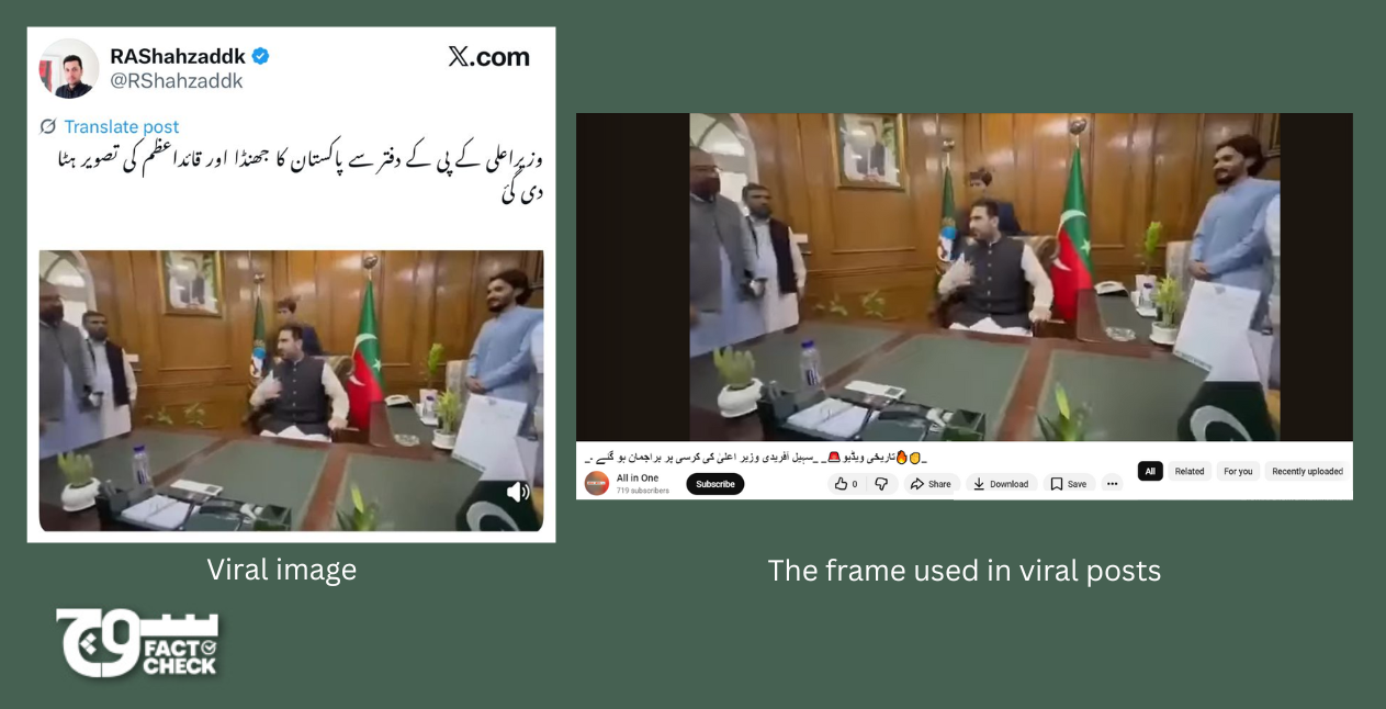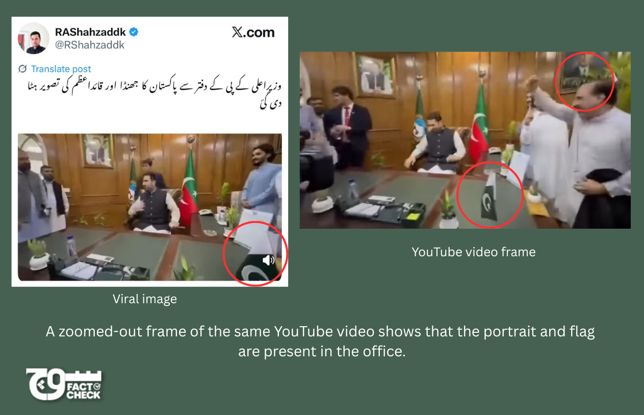 Fact: The claim is false. The image accompanying the viral claim is a zoomed-in frame that does not show Jinnah’s portrait and the Pakistani flag. However, a review of the available footage revealed both the flag and portrait were present in the office when the KP CM entered his office.