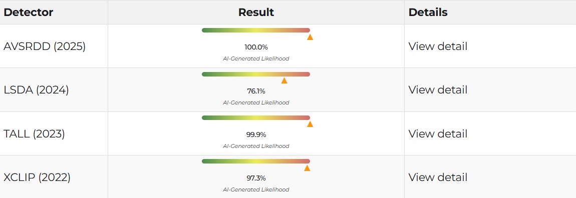 We first used the AVSRDD (2025) model, which is an AVSR-based audio and visual deepfake detection method that leverages speech correlation. The model uses dual-branch encoders for audio and video to support independent detection of each modality. It rated the likelihood of the video being fake at 100%.