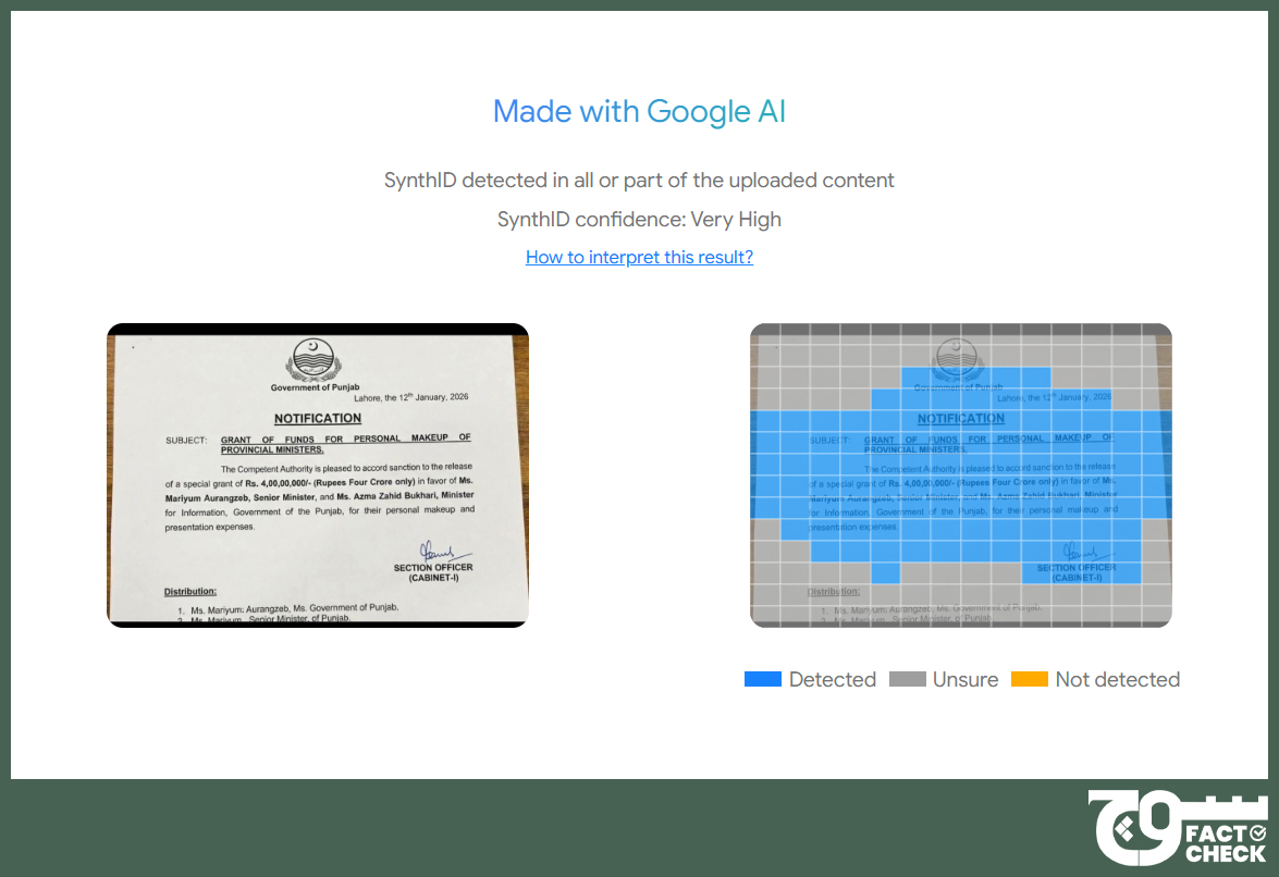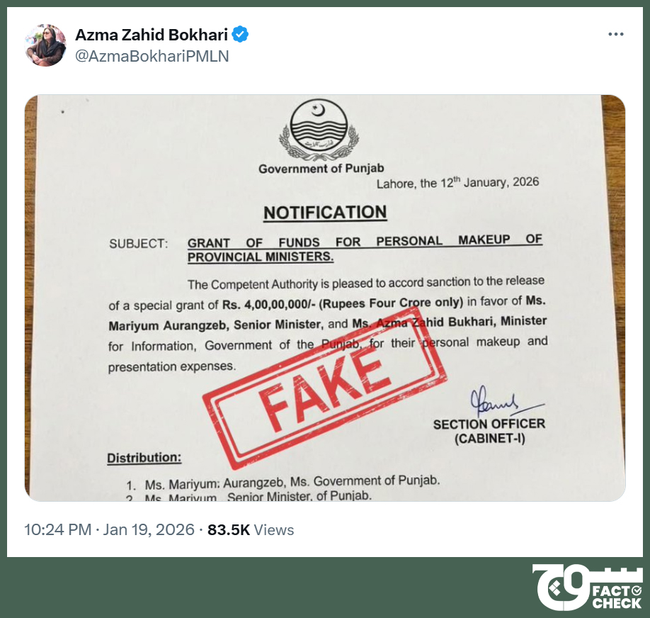 On 19 January 2026, multiple social media users shared a notification apparently issued by the Punjab government, approving a “special grant” worth PKR 40 million for the “personal makeup and presentation expenses” of Punjab Senior Minister Marriyum Aurangzeb and Punjab Information Minister Azma Bokhari (archived here, here, here, here, and here, respectively).