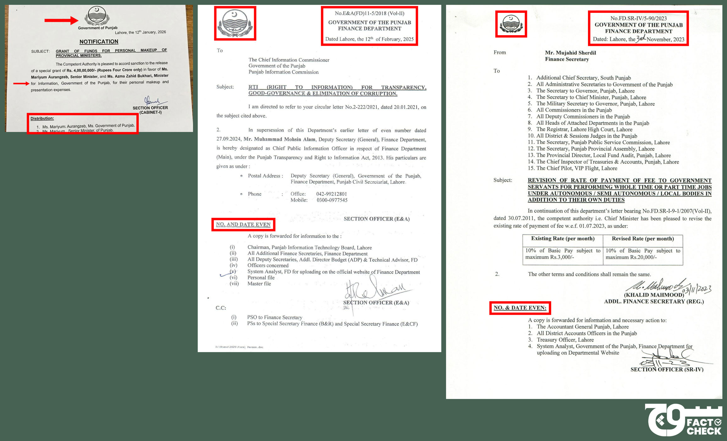 Errors highlighted in the viral notification (left), which also contains missing elements that are marked in authentic documents issued by the Punjab Finance Department on 12 February 2025 (centre) and 3 November 2023 (right) and provided here for comparison.