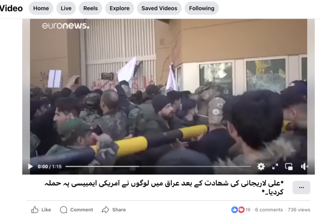 A Facebook user posted a video (archive) apparently showing the US embassy in Iraq getting attacked after Ali Larijani, a top Iranian national security official, was killed in an Israeli airstrike on 17 March. Here is the screenshot of the post: