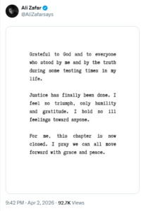 Zafar did share a note on his Instagram and X account on 2 April 2026 about the verdict in the defamation case against Shafi.