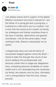 On 19 April 2018, amid the global MeToo movement, Meesha Shafi took to X (formerly Twitter) and accused Zafar of sexual harassment. She shared a note recounting her experience, with the following caption, “Sharing this because I believe that by speaking out about my own experience of sexual harassment, I will break the culture of silence that permeates through our society. It is not easy to speak out.. but it is harder to stay silent. My conscience will not allow it anymore #MeToo.”