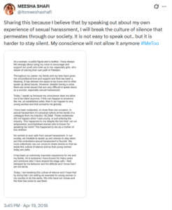 She also gave an update on Shafi’s original harassment complaint, saying, “Meesha Shafi’s original complaint of sexual harassment against Ali Zafar has been pending before the Supreme Court for several years now.”