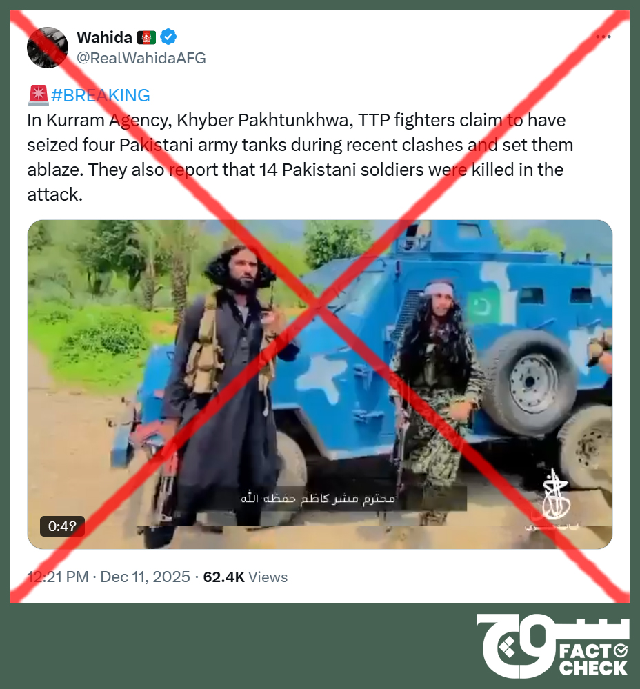 Claim: A video shows TTP fighters speaking in a video after capturing and burning the Pakistan Army’s tanks in Kurram. The accompanying caption claims over a dozen soldiers were also killed.
