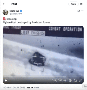 A user on X claiming the footage showed Pakistan destroying an Afghan post.