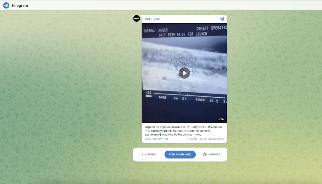 The X post by Euromaidan Press also provided a link to a Telegram channel, titled [translated via Google Translate] “NIP Tysk”. According to the channel’s description, the title stands for “National Information Portal ‘Tysk’”. The same footage was shared here on 22 January 2023, with the description [translated from Ukrainian via Google Translate]: “A strike on enemy infantry with the Stugna-P ATGM. Probably using a newly manufactured missile with a high-explosive fragmentation warhead.” An image of the post is given below: