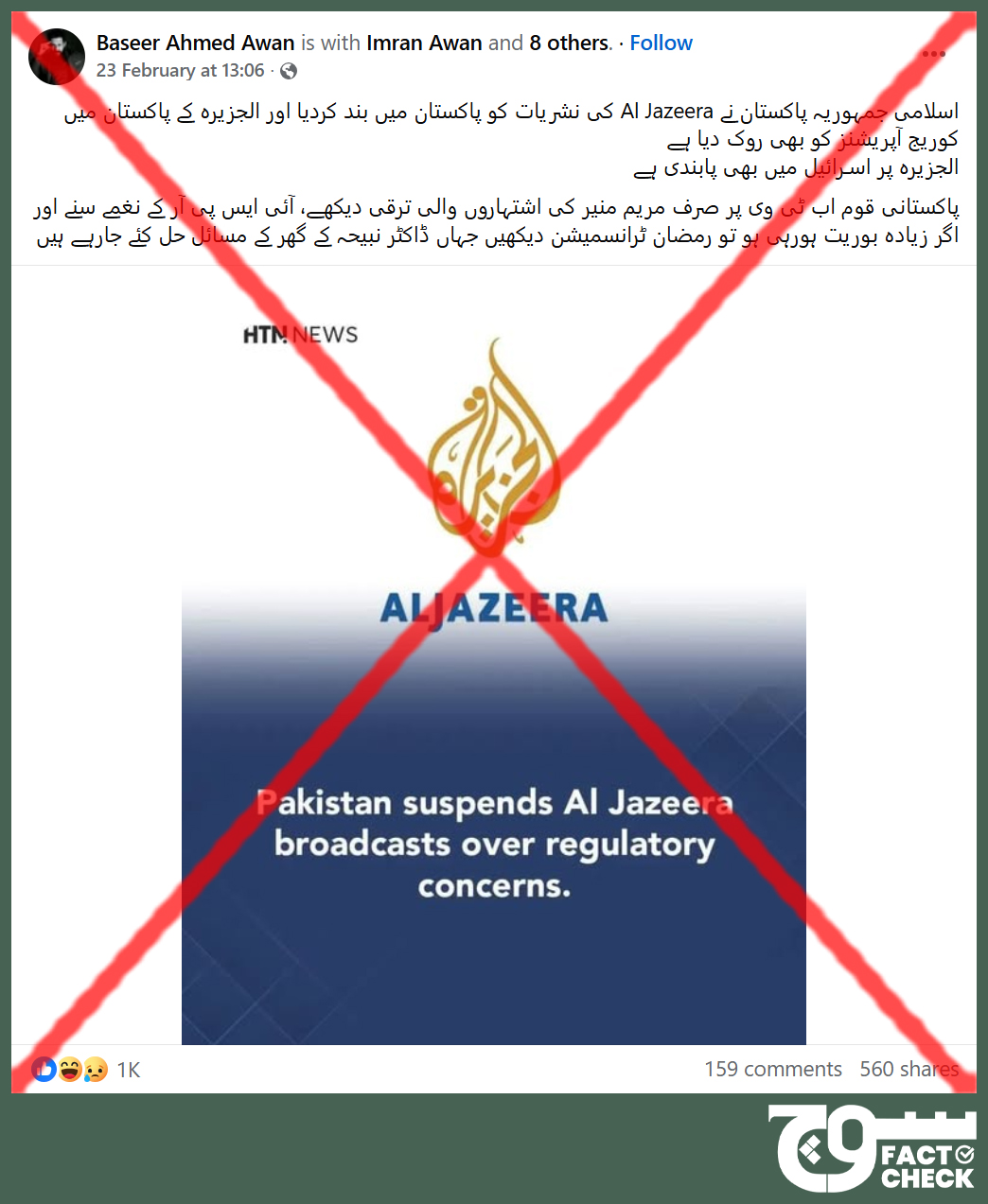On 23 February 2026, Facebook user ‘Baseer Ahmed Awan’ posted (archive) a visual with the text, “Pakistan suspends Al Jazeera broadcasts over regulatory concerns.”
