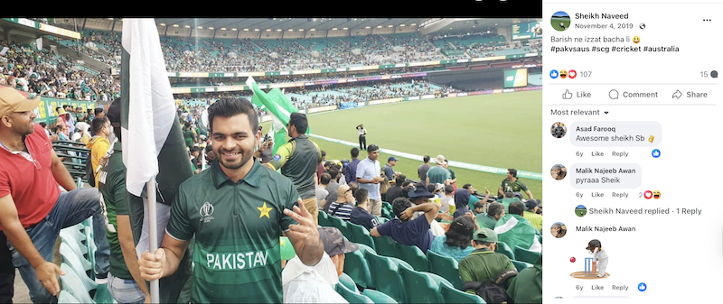 A Facebook post shared by “Sheikh Naveed” in November 2019 shows him wearing the green Cricket jersey.
