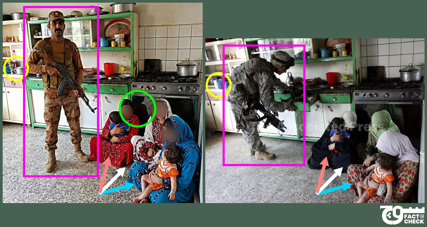 Claim: A photograph shows Pakistani soldier holding Baloch women and children at gunpoint inside their home.