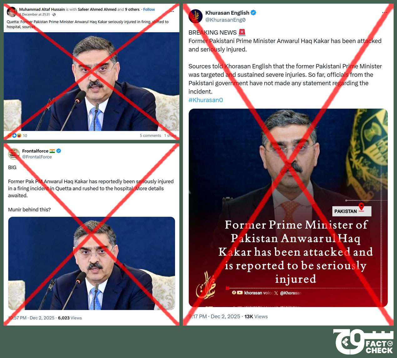 On 2 December 2025, multiple Pakistani, Afghan, and Indian accounts claimed that Pakistan’s former caretaker Prime Minister Anwaar-ul-Haq Kakar was “seriously injured” in a “firing incident” in Quetta and “rushed to the hospital” (archived here here and here).