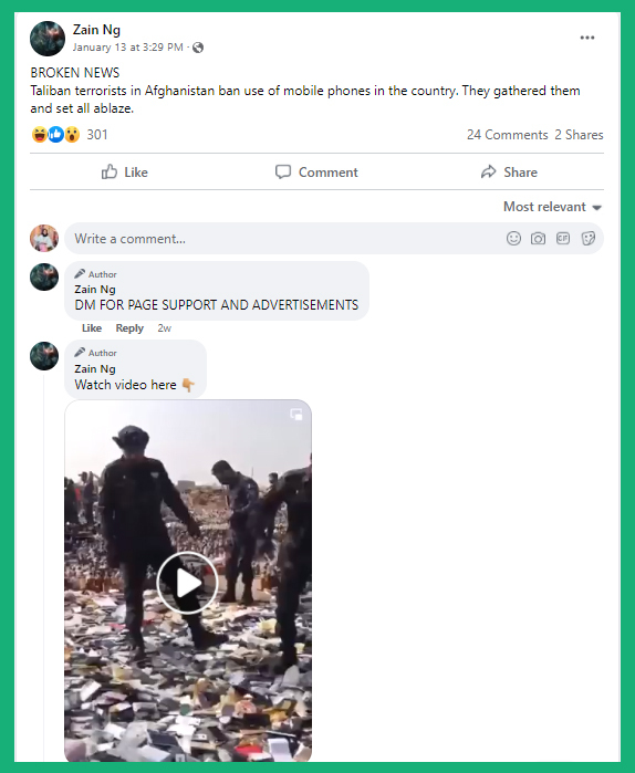 On 13 January 2022, Facebook page Zain Ng shared a video claiming that it depicts the Taliban destroying mobile phones in Afghanistan. The video shows men in uniform stomping on mobile phones and other electronic devices while someone can be heard giving instructions in Urdu in the background. The caption of Zain Ng’s post reads, “Taliban terrorists in Afghanistan ban use of mobile phones in the country. They gathered them and set all ablaze”. The video was posted in the comments section.