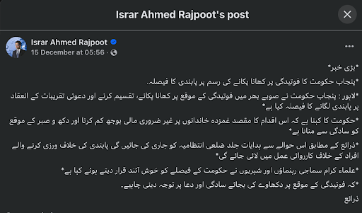 A post by Facebook user Israr Ahmed Rajpoot claimed that the Punjab government is implementing a complete ban on serving and distributing food at funerals, citing this as a positive step for bereaved families.