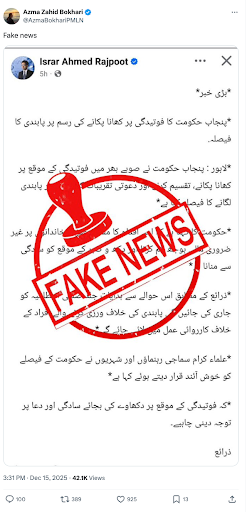There has been no official announcement or notification by the Punjab government banning food at funerals in the province. Moreover, Minister of Punjab for Information and Culture Azma Bokhari has refuted the claim.