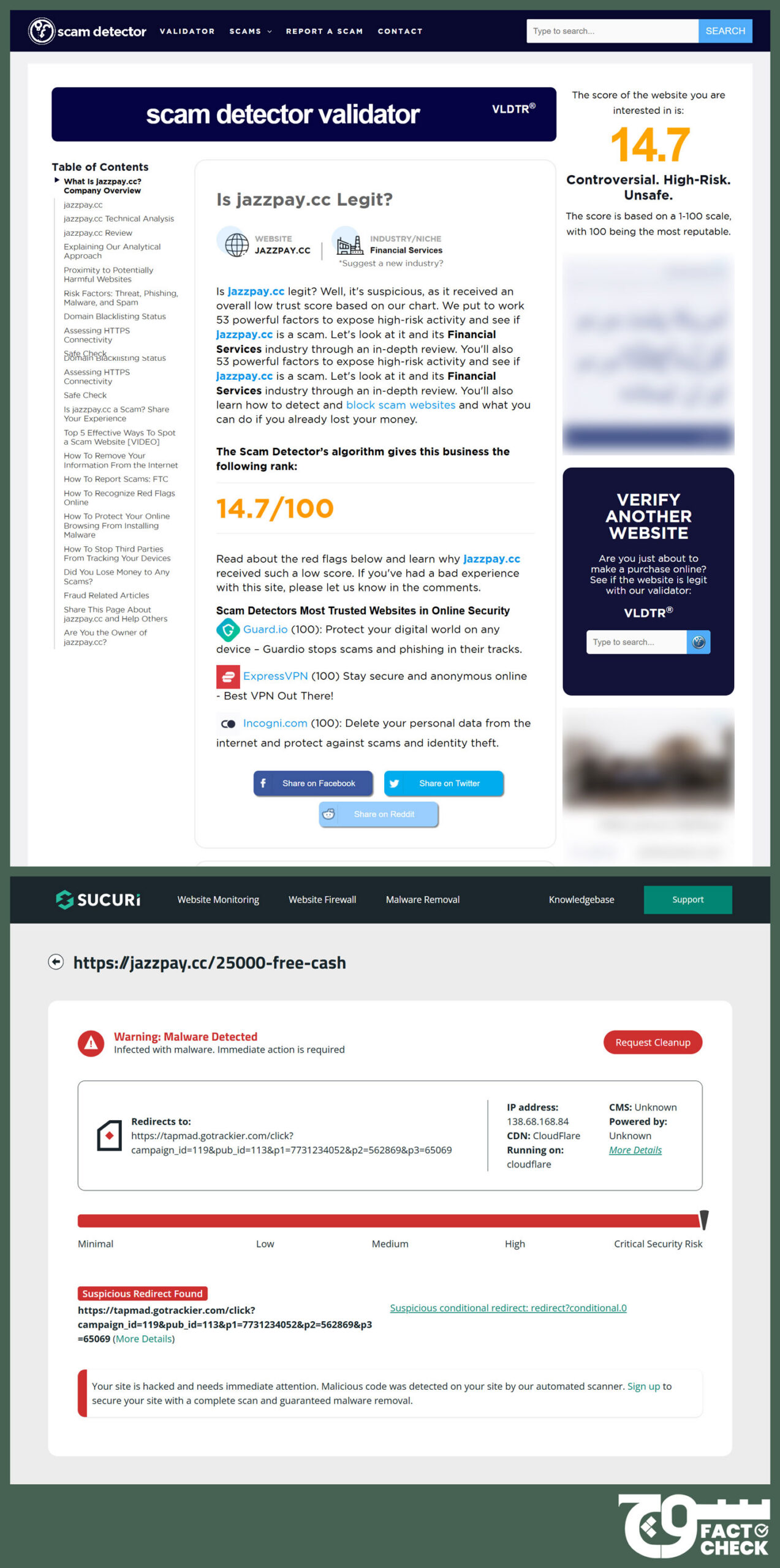 On the other hand, we ran the URL “https://jazzpay.cc/25000-free-cash” through multiple detection tools, such as ScamAdviser, Fraud Detector, Pulsedive, Scam Detector, Norton’s AI-powered Genie, and Sucuri SiteCheck, as well as Uniform Resource Locator (URL) checker URLert and IPQualityScore (IPQS), a fraud detection and cyber security website.
