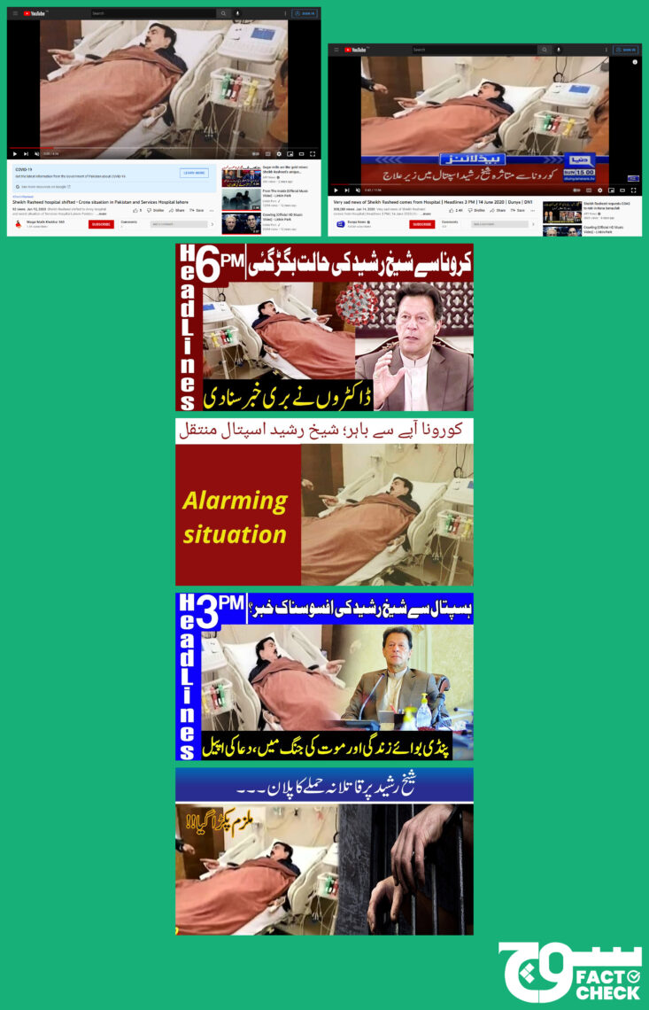 The image was broadcast by Dunya News at the 42-second mark in its 3 PM headlines on 14 June 2020, archived here, and YouTube channel Waqar Malik Khokhar 360 at the 0:39 mark, archived here. Express News ran the report at the 2:31 mark in its 6 PM headlines on 14 June 2020 and the picture of Rashid can be seen in its thumbnail. It was posted here on Twitter as well. In 2021, it was shared on the verified YouTube channel of 24 News.