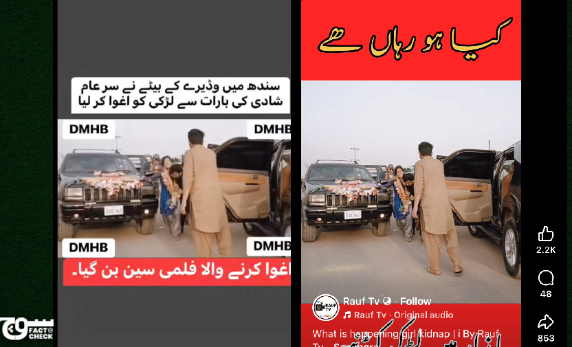 On 18 November, a Facebook user posted a video (archive) that purportedly showed the son of a “wadera” (a feudal lord) kidnapping a bride in broad daylight. The description of the footage states [translated from Urdu into English]: “In Sindh, a feudal’s son publicly kidnapped a bride and made a dramatic scene.”