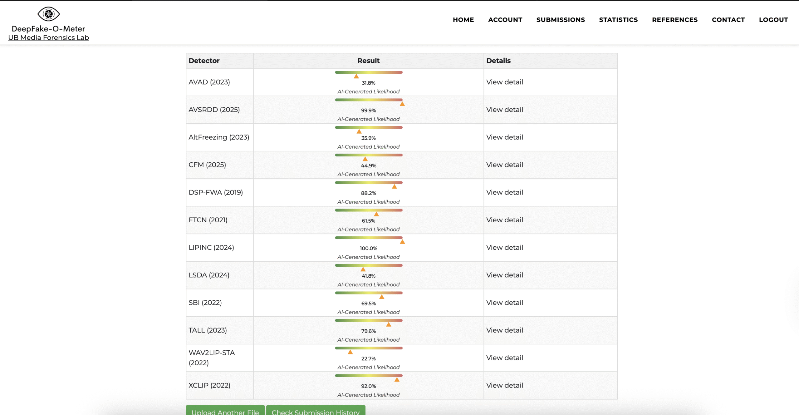 Furthermore, running the clip through deepfake detection tools confirms that it is AI-generated. One such tool is Deepfake-O-Meter, an initiative of the University of Buffalo, which uses various algorithms to determine whether a video is real or fake. Seven out of twelve algorithms returned probabilities above 50%, indicating that it is a deepfake, as shown below:
