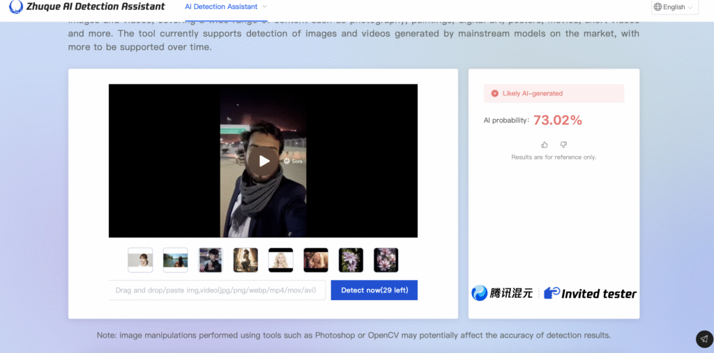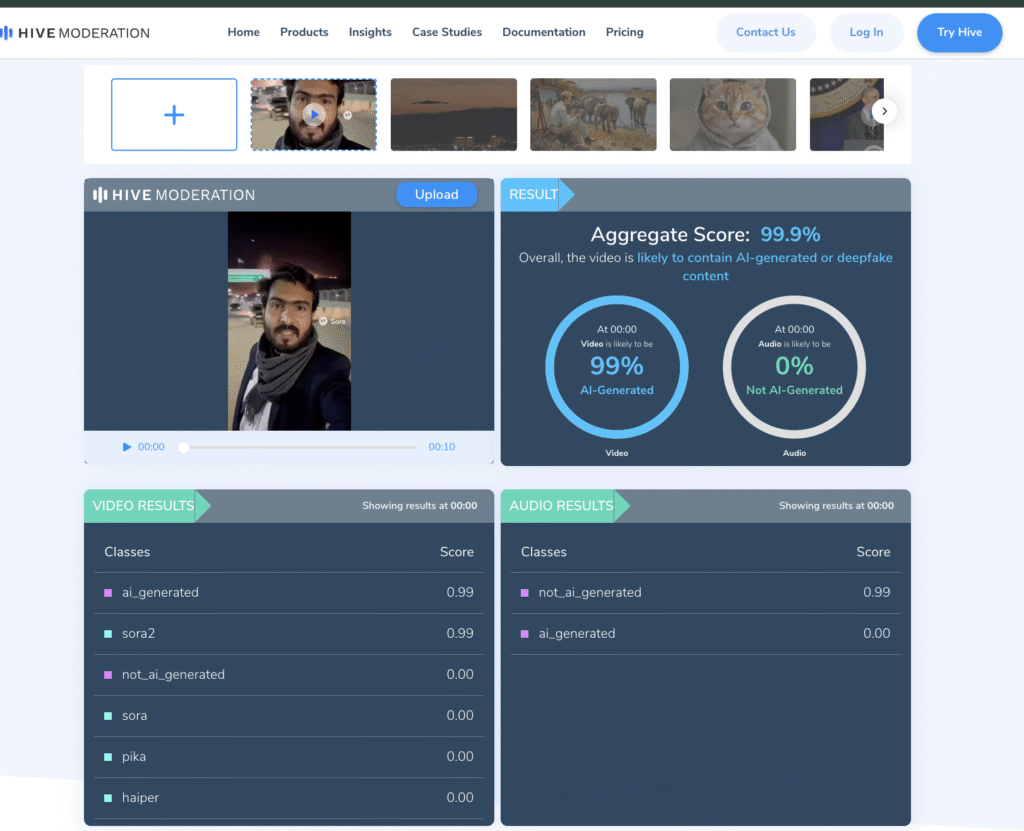 Further analysis with AI detection tools, including Zhuque AI Detection Assistant and Hive Moderation, also confirms that the clip is AI-generated. Both returned probabilities of 100% and 99.9%, respectively. The results are shown below: