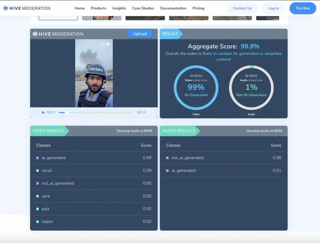 An analysis of the video using AI-detection tools also confirms that the clip is AI-generated. Zhuque AI Detection returned a probability of 73.02%, indicating it is likely AI-generated. Hive Moderation gave a total score of 99.9%, which confirms that “the video is likely to contain AI-generated or deepfake content”. The results for this clip are shown below: