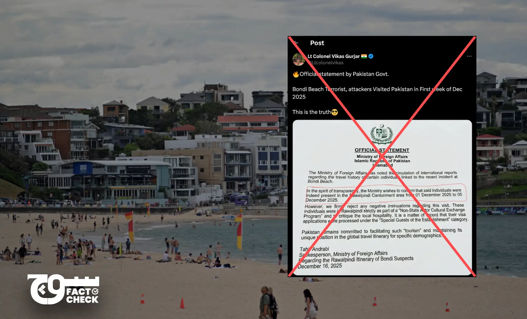 Author: Shameneh Majid Claim: Pakistan’s Ministry of Foreign Affairs has confirmed that the Bondi Beach attackers visited Pakistan between 1 and 5 December 2025. Fact: The claim is false. No such statement has been issued by the Ministry of Foreign Affairs. Recently an X post by user ‘Lt Colonel Vikas Gurjar’ claimed that Pakistan’s Foreign […]