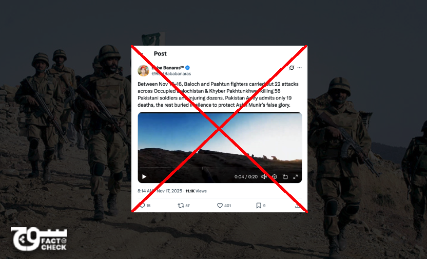 Claim: A video shows Pakistan Army soldiers under attack by ‘Baloch and Pashtun fighters’ in Balochistan and Khyber Pakhtunkhwa in November 2025. Fact: The clip is old and has been online since at least December 2023. On 17 November, an X user that Soch Fact Check has fact-checked several times in the past, posted a […]
